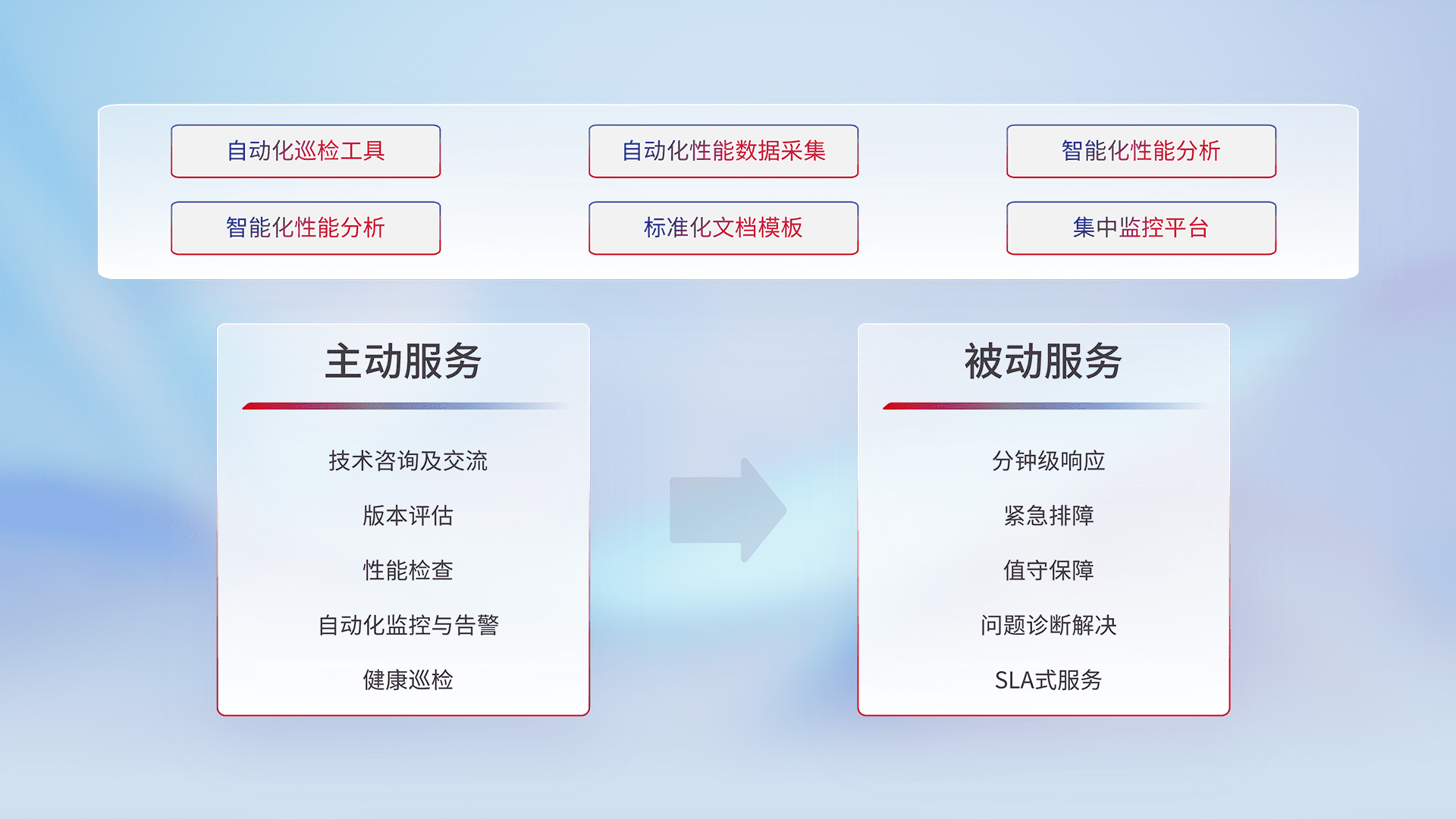 智能化工具和标准化文档,,保障服务质量,,,,提供主动服务(包含技术咨询、、、、版本评估、、、、性能检查、、、、自动化监控与告警、、健康巡检)和被动服务包含(分钟级响应、、、紧急排障、、、、值守保障、、、、问题诊断解决、、SLA服务)。。。